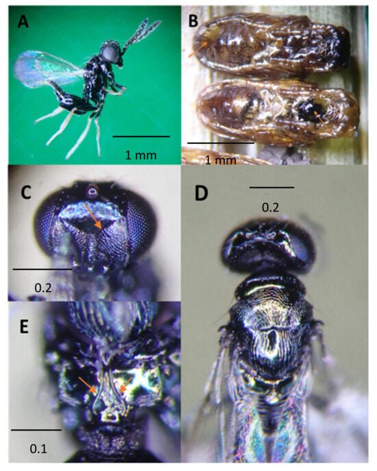 Pediobius imbreus, (A) side habitus of female, has a body mostly dark with less metallic reflections, antennae inserted at the lower level of eyes, coxae, trochanters, femora black, tibiae, and tarsus coloration varied between specimens in HDOA collection, some specimens with all dark or all white, with or without metallic bluish reflections; (B) exit holes from pupae of Aroplectrus dimerus (red arrows on exit holes anterior with hyper pupal molt, and posterior of pupa); (C) head front view showing transverse frontal suture extended close to compound eyes; (D) scutum reticulate, scutellum with longitudinal reticulate sculpture having a median narrow, smooth band, broad head pronotum, and reticulate sculptured mesothorax; (E) propodium with divergent middle carina and lateral propodeal plicae. Propodeum short, with submedian carinae diverging posteriorly (pictures taken using MMR).