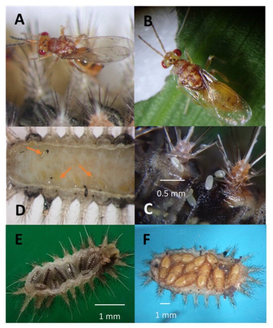 Biologically, species of Pediobius are quite diverse, acting as primary or secondary parasitoids, utilizing eggs, larvae, and pupae of species in the insect orders Coleoptera, Diptera, Hemiptera, Hymenoptera, Lepidoptera, Mantodea, and Thysanoptera [,]. Pediobius imbreus has also been recorded as a primary parasitoid of Limacodiid pests in India [,]. However, primary parasitism was not observed in the Hawaii infestations. Pediobius imbreus, with a natural incidence ranging from 2–10%, was observed in slug caterpillars affected gardens, and laboratory studies of this parasitoid revealed that it is a hyper parasitoid on Bracon hebetor, and its parasitization efficiency and longevity on slug caterpillar was recorded [].
