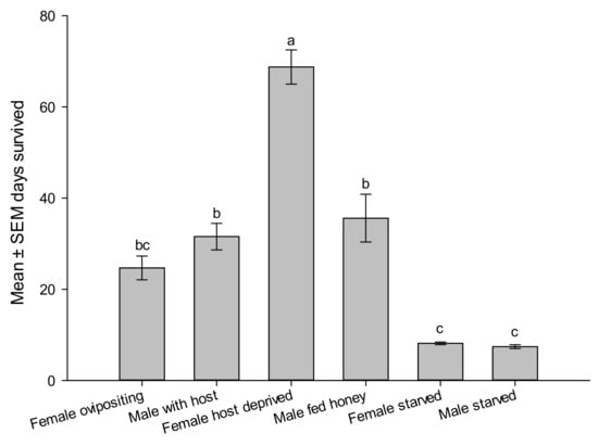 Survivorship of male and female Aroplectrus dimerus under laboratory conditions. All wasp categories fed honey and had access to water, except starved wasps. Different letters on top of bars indicate significant differences (ANOVA, p < 0.0001).