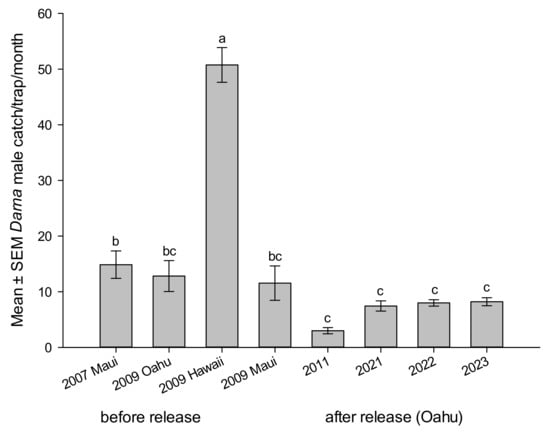 Mean number of Oxyplax pallivitta lured into male pheromone traps per month on the Hawaiian Islands before parasitoid release during 2007, 2009, and after parasitoid establishment during 2011, 2021–2023 on Oahu Island. Different letters on top of bars indicate significant differences (ANOVA, p < 0.0001).
