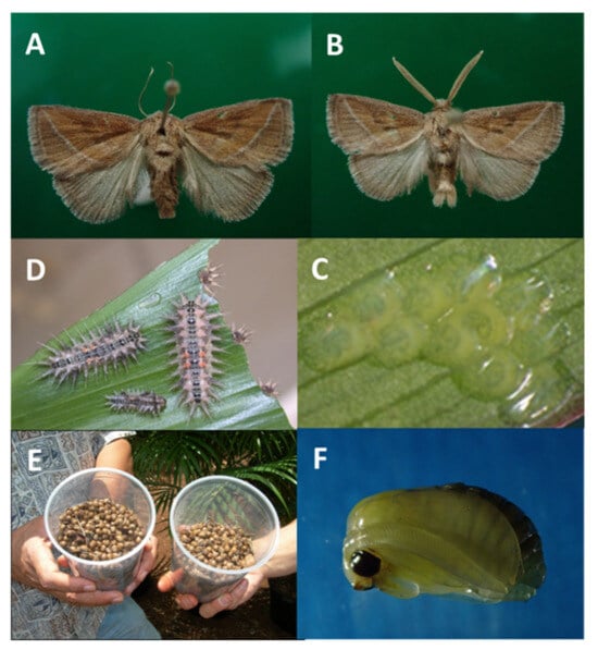 Oxyplax pallivittus: (A) female habitus; (B) male habitus see bipectinate antennae and end of abdomen; (C) flat eggs (1.6 mm length); (D) stinging larvae (L6–L10); (E) spherical cocoons collected from Oahu nursery in thousands in 2007 (6.5 mm Ø); (F) male pupa removed from the cocoon. Photos taken using MMR, WTN.