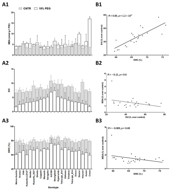 Morpho-physiological traits’ evaluation and their correlations of twenty-two accessions under examination. MDA quantification (A1), SVI (A2), and SWC (A3). The control (gray dashed bars) and simulated water stress conditions (white bars) are shown. The means ± standard deviation were derived from three independent experiments, each of which was analyzed in triplicate. Spearman’s rho correlation between SWC and SVI (B1), between SVI and MDA (B2), and between SWC and MDA (B3) for the twenty-two accessions under examination are shown. SVI and MDA content is expressed as a percentage of the respective control, as different genotypes resulted in having significantly different constitutive SVI and MDA amounts (p < 0.05) in control conditions.