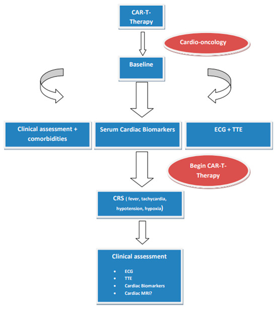 Proposed protocol in patients treated with CAR-T cells. Abbreviations: CRS, cytokine release syndrome; ECG, electrocardiogram; MRI, magnetic resonance imaging; TTE, transthoracic echocardiogram.