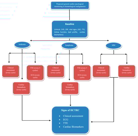 Proposed simplified cardio-oncological monitoring/surveillance algorithm in hematological malignancies. This protocol should be modified according the possible HCTRC effects of therapeutic regimens. Abbreviations: CVD, cardiovascular disease; CRF, cardiac risk factors; ECG, electrocardiogram; HCTRC, hematological cancer therapy-related cardiotoxicity; MM, multiple myeloma; TTE, transthoracic echocardiogram.