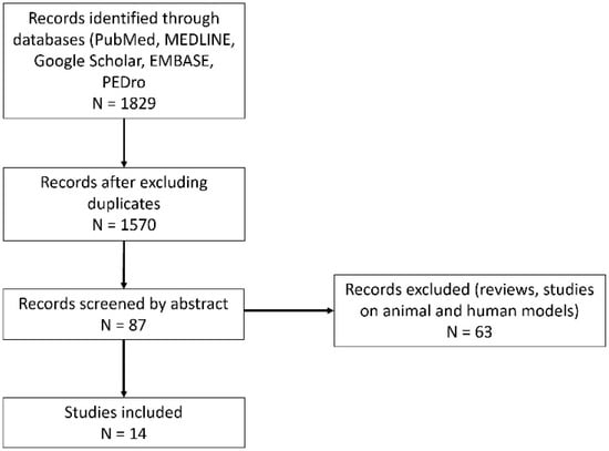 We searched PubMed, MEDLINE, Google Scholar, EMBASE, and PEDro, starting from inception up to 2023, following the MeSH terms lateral epicondylitis OR radial epicondylitis OR common extensor tendinopathy OR tennis elbow AND botulinum toxin. Inclusion criteria were clinical trials on human subjects published up to December 2023. Two authors independently performed this task, and they gathered 1820 titles. After excluding duplicates, 1570 titles were selected, and titles were analyzed. From the remaining 87 relevant titles, the authors independently read the abstracts, excluded the reviews, and retained 14 clinical studies [10,11,12,13,14,15,16,17,18,19,20,21,22,23]. There were 63 articles excluded for being studies on animal models or on cultured cells. All disagreements were solved by discussion with all team members. All studies but one ([11], written in German) were written in English. Our paper aims to identify the indications of BTX-A for LE, the targeted structures, the most valuable injection technique, the dosage, timing, and the side effects.