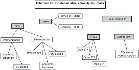 - Song, B.; Day, D.B.; Jayaram, P. Efficacy of Botulinum Toxin in Treating Lateral Epicondylitis—Does Injection Location Matter?: A Systematic Review. Am. J. Phys. Med. Rehabil. 2020, 99, 1157–1163. [Google Scholar] [CrossRef]