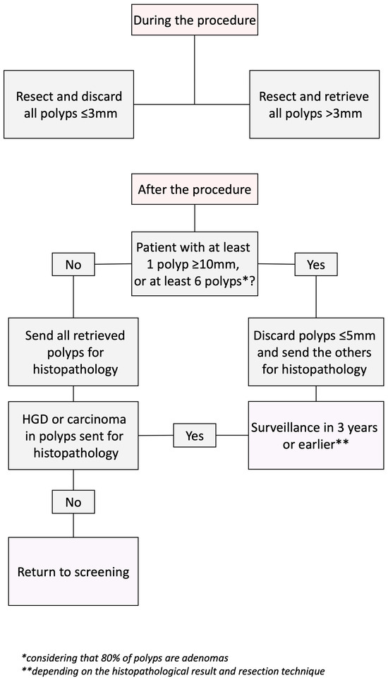 In the case of 3–5 mm polyps, the same plan of action could be applied in selected cases. However, as we have shown, these polyps, especially 0–Isp and 0–IIa type lesions, can harbor HGD in older, male patients. There is also a very small chance of up to 0.08% of them being cancerous, although large sample studies did not identify any cancers in diminutive as well as small polyps [18,19,20,21]. In this aspect we suggest a more prudent approach which should consider patient follow-up as well. Current guidelines recommend surveillance colonoscopy after 3 years for patients with the complete removal of at least 1 adenoma ≥10 mm or with high-grade dysplasia, or ≥5 adenomas, or any serrated polyp ≥10 mm or with dysplasia [22]. In this context, the choice to resect and retrieve or resect and discard could be based on the number and size of all lesions found during the colonoscopy. If a patient has less than five polyps and all are 3–5 mm, then these should be retrieved and the decision to either return to screening or continue surveillance should be based on the histopathological results. If, however, a patient has more than five 3–5 mm polyps or at least one ≥10 mm, all resected polyps under ≤5 mm should be discarded, as this would not change the patient’s need to undergo a surveillance colonoscopy. This should also reduce procedure-related costs. A proposed algorithm which summarizes these suggestions is found in Figure 2. Considering that the strategy proposed by us involves resecting and discarding some of the polyps, we have divided the moment when this decision is made into two stages. In the first stage, during the procedure, all polyps ≤3 mm can be resected and discarded. In this stage, polyps larger than 3 mm must be resected and retrieved. In the second, post-procedural stage, it is decided whether retrieved polyps with dimensions between 3 mm and 5 mm are sent for a histopathological examination or are discarded, depending on the other two variables: the total number of polyps and the presence of polyps larger than 1 cm. Post hoc analysis showed that the accuracy of this algorithm was 98.6%, which far exceeded the advanced optical diagnosis accuracy of 71.6% that we reported, and is even higher than the AI-assisted NBI-trained expert accuracy of 90.2% previously reported in another study as well as the proposed 90% agreement with pathology-based management according to the 2020 US Multi-Society Task Force guidelines [23,24].