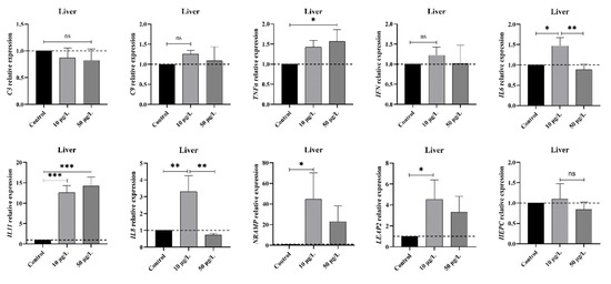 To delve deeper into the immune responses at the transcriptional level following exposure to NIC, an analysis of mRNA expression patterns of select immune-related genes was conducted utilizing the qPCR technique. The results depicted in Figure 1 reveal a notable increase in the gene expression levels of proinflammatory cytokines tnfα, il8, and il6 within the liver of M. piceus in the 10 μg/L NIC group compared to the control group. Interestingly, il8 and il6 subsequently decreased to levels below those of the control group within the 10 μg/L NIC group. The expression levels of il11 exhibited a dose-dependent increase, with levels 12.6- and 14.2-fold higher in the 10 and 50 μg/L NIC groups compared to the control group. Conversely, the mRNA levels of hepc, c3, c9, and ifn remained unchanged following NIC exposure across all groups. Additionally, the relative expression of nramp and leap2 was significantly elevated in the 10 μg/L NIC group relative to the control group but returned to baseline levels in the 50 μg/L NIC group.