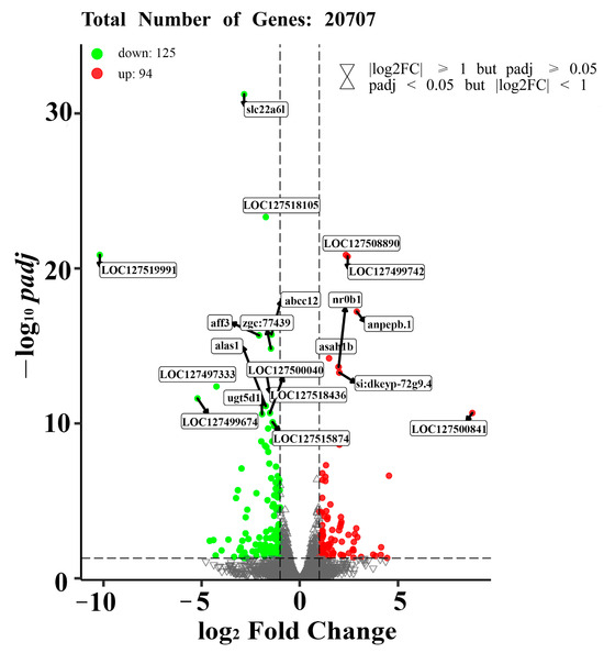 The figure shows the volcano plots of DEGs in the liver of M. piceus treated with50 µg/LNIC. Red and green dots indicate upregulated and downregulated genes, respectively.