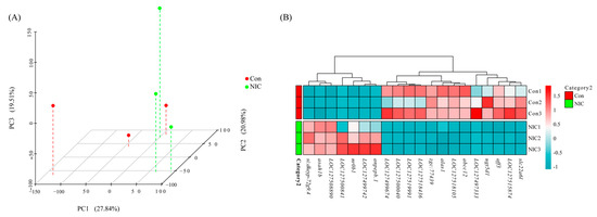 Six cDNA libraries were generated and analyzed from the livers of M. piceus exposed to immersion in 50 μg/L NIC, as well as a control group. The characteristics of these libraries are detailed in Table S2. Following quality control procedures for the sequencing data, the number of clean reads per library ranged from 42,210,450 to 62,012,864, with a Q30 value exceeding 97.05% for each library. Subsequently, the RNA sequence data obtained in this study were deposited in the NCBI Sequence Read Archive (SRA) at http://www.ncbi.nlm.nih.gov/sra, accessed on 23 October 2023. Based on the results of differential expression analysis conducted using DESeq2 (1.16.1), a total of 219 differentially expressed genes (DEGs) were identified between the control group and the group exposed to 50 μg/L of NIC. These DEGs were visualized through the use of volcano plots, revealing that 94 genes were upregulated and 125 genes were downregulated in the 50 μg/L NIC group (Figure 2). Furthermore, principal component analysis (PCA) was performed in three dimensions to assess changes in the transcriptomes, demonstrating distinct variation between the NIC-exposed and control samples (Figure 3A). Additionally, several DEGs related to detoxification, immune response, and drug metabolism were observed in M. piceus following exposure to NIC (Figure 3B, Table S3).