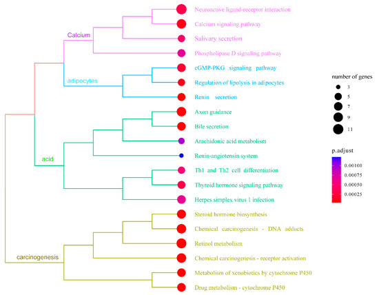 In order to enhance the understanding of the biological function of DEGs, the Gene Ontology (GO) and Kyoto Encyclopedia of Genes and Genomes (KEGG) pathway enrichment analysis was conducted comparing the control and NIC groups. A total of 219 DEGs were successfully categorized into three primary groups: biological process (BP), cellular component (CC), and molecular function (MF). The most enriched GO terms in the BP category were the regulation of cholesterol biosynthetic processes (GO:0006695), followed by the regulation of cholesterol efflux (GO:0033344), cholesterol homeostasis (GO:0042632), and lipoprotein metabolic process (GO:0042157). In the CC category, the terms of extracellular region (GO:0005576), blood microparticle (GO:0072562), and high-density lipoprotein particle (GO:0034364) were also significantly enriched. In the MF category, the most enriched GO terms were heme binding (GO:0020037), iron ion binding (GO:0005506), oxidoreductase activity (GO:0016712), cholesterol binding (GO:0015485), and heat shock protein binding (GO:0031072) (Figure 4, Table S4). The KEGG pathway enrichment analysis indicated that exposure to 50 µg/L NIC resulted in the alteration of 264 pathways in M. piceus. Among these pathways, retinol metabolism (ko00830, 10 DEGs), drug metabolism—cytochrome P450 (ko00982, seven DEGs), metabolism of xenobiotics by cytochrome P450 (ko00980, seven DEGs), and steroid hormone biosynthesis (ko00140, eight DEGs) were significantly enriched in the 50 µg/L NIC exposure groups. (Figure 5, Table S5).