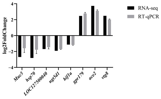 In order to corroborate the findings of RNA-seq, a total of eight DEGs were chosen for qPCR analysis. The outcomes demonstrated a strong concordance between the gene expression levels obtained through qPCR and those obtained through RNA-seq, thereby affirming the credibility of the RNA-seq results (Figure 6).