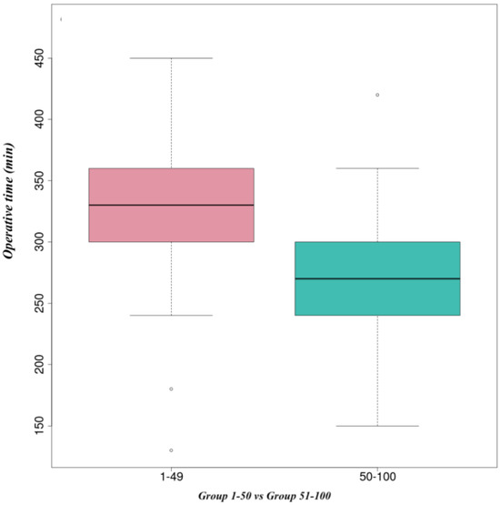 From 2013 to 2018, we analyzed the first 100 pancreaticoduodenectomies performed by a single surgeon. We found that there were 60 males (25 operated in the first 50 cases) and 40 females (24 operated in the first 50 cases). The median ages of the patients in Groups 1 and 2 were 68 (55–84) and 66 (42–85) years old, respectively. The median operative time decreased from Group 1 where was 333 min to 270 min in the second group, p = 0.1 (Figure 1 and Figure 2). The median blood loss was 350 mL in the first group, while in the second group, the median was 200 mL, p < 0.001 (Figure 3 and Figure 4). The median length of stay decreased from Group 1 to Group 2, 11 (7–44) versus 10 (7–30) days. A total of 39% of the patients had a preoperative biliary drainage, which was performed endoscopically in 33% of cases and surgically (laparoscopic cholecystostomy) in 6% of cases. A total of 45% of the patients presented with cholangitis (positive biliary cultures—intraoperative bile harvest). We did not find any significant association of complications in patients with positive biliary cultures (p = 0.714).