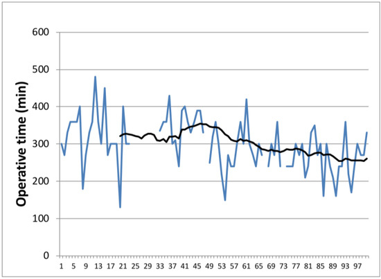 Data from the current study confirm the findings of Tseng et al. Similar to Tseng et al., this study showed improvements in operative time (333 min vs. 270 min), blood loss (350 mL vs. 200 mL), and the length of stay with experience (11 vs. 10 days). However, in this study, improvements were seen after 50 cases. This demonstrates that there is a learning curve but it depends on every surgeon due to the individual ability, training volume in preoperative, operative, and postoperative care, the complexity of the cases, and the presence of an experienced multidisciplinary team.