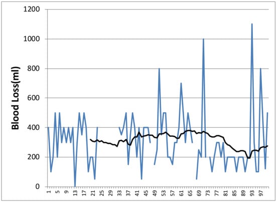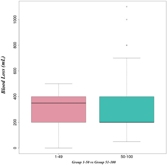Median of blood loss (comparative between group 1–50 vs. group 51–100).