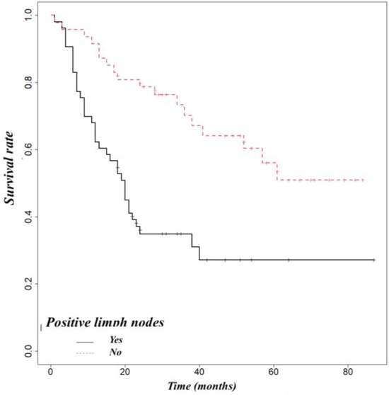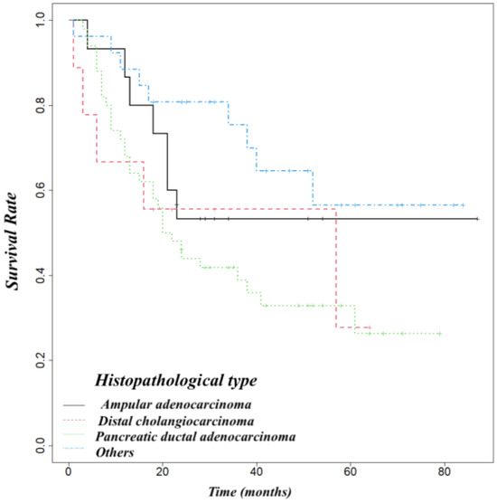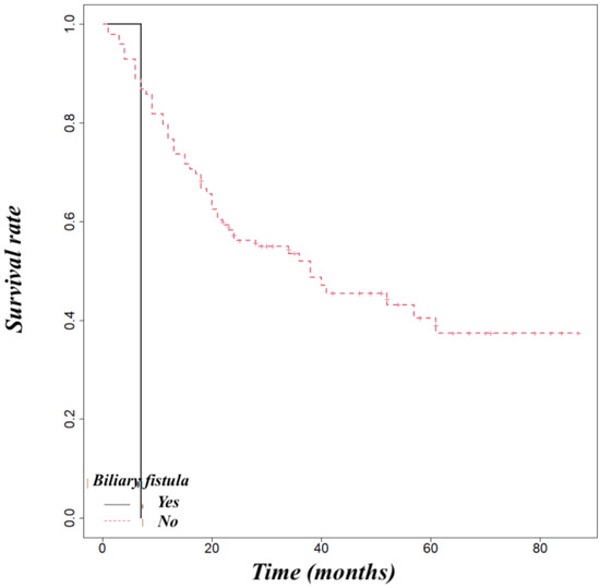 Pancreatic adenocarcinoma had a worse overall survival than ampullary cancer (OS at 5 year 52%) or distal cholangiocarcinoma (OS at 5 years 54%) (Figure 5). We found that biliary fistula (p = 0.025) (Figure 6), resection edge-R1 (p < 0.001) (Figure 7), and lymph node metastases (p < 0.001) (Figure 8) negatively influenced the survival rate.