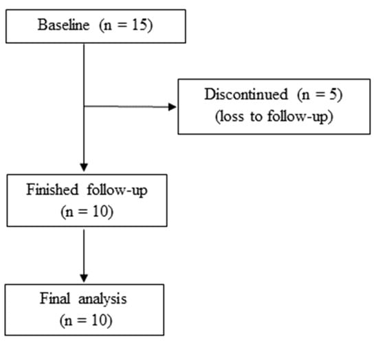 In this prospective cohort study, fifteen non-insulin-dependent outpatients with T2DM attending the “N. C. Paulescu” National Institute of Diabetes, Nutrition and Metabolic Diseases in Bucharest, Romania, were enrolled between April and September 2009. Ten patients (five men and five women) remained in the study and were comparatively evaluated at the initial clinical onset (baseline) and after five years of disease progression (follow-up, September to December 2014). Figure 1 represents a CONSORT diagram of our study.