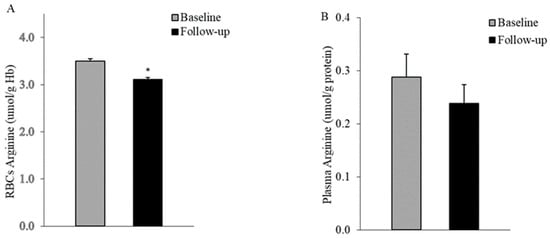 L-arginine pool is decreased in RBCs (A) while remaining similar in the plasma (B) of T2DM patients after five years of disease progression (n = 10). Values are mean ± SEM; * p < 0.05 between groups, paired t-test.