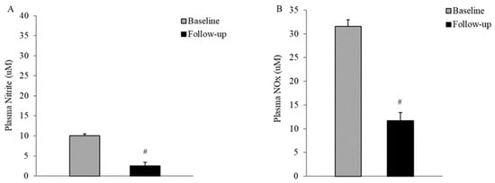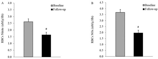 NO, represented by both nitrite and total NO production, exhibited a decrease in RBCs (2.60 ± 0.23 vs. 1.64 ± 0.22 μM/g Hb, p = 0.007; 3.69 ± 0.36 vs. 1.97 ± 0.25 μM/g Hb, p = 0.001, for nitrite and nitrite plus nitrate, respectively, paired t-test) and plasma (10.0 ± 0.45 vs. 2.51 ± 0.15 μM, and 31.5 ± 1.38 vs. 11.6 ± 0.83 μM, for nitrite and nitrite plus nitrate, respectively, p < 0.01, Wilcoxon test) during the follow-up period, as depicted in Figure 4 and Figure 5, compared to the baseline.