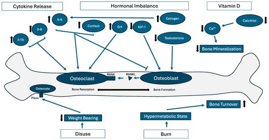 Post-traumatic osteoporosis can be caused by a wide range of traumatic processes, including burns and musculoskeletal injury, and is thus complex in nature (Figure 1) [2,3]. However, on the cellular and molecular levels, dysregulation of the biomineralization process takes a similar form across many diseases [23,24]. Biomineralization is a dynamic process of bone resorption by osteoclasts and formation by osteoblasts, intricately regulated by hormones and cytokines in the bone microenvironment. In polytrauma cases, an increase in cytokines interleukin (IL)-1β and IL-8 has been shown, as well as an increased IL-6/IL-10 ratio [25,26]. IL-1β is known to play a role in mediating osteoclastogenesis, osteoclast differentiation, and receptor activator in NF-kβ ligand (RANKL) expression [27,28,29,30,31]. IL-8 is a regulator of osteoclastogenesis as well and an inducer of nuclear factor of activated T cells 1 (NFATc1) activation by receptor activator of NF-kβ (RANK) [29,31]. IL-6 is known to upregulate osteoclastogenesis and downregulate osteoblastogenesis [32]. Increases in osteoclastogenesis and subsequent differentiation as well as a decrease in osteoblastogenesis lead to a catabolic state in the bone wherein resorption outcompetes synthesis, leading to demineralization and osteoporosis.