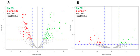 Volcano plot of peroxide treatment-associated miRNA expression. (A) Seven days of treating SH-SY5Y neuroblastoma cells with H2O2 and ATRA simultaneously resulted in the increased and decreased expression of 83 and 122 miRNAs, respectively, whereas (B) a three-day pre-treatment of cells with H2O2 before adding ATRA caused expression alteration of 129 miRNAs, 52 up- and 77 down-regulated, in comparison to the cells differentiated in the absence of peroxide (FDR < 0.05 (horizontal blue line) and |log2FC| > 0.6 (vertical blue lines)). The red and green dots represent down- and up-regulated miRNAs, respectively.