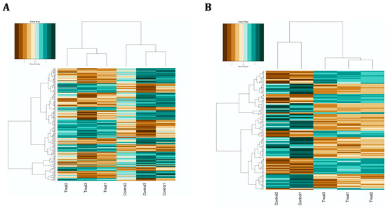 Unsupervised hierarchical clustering of the differentially expressed miRNAs in (A) co-treatment and (B) pre-treatment conditions. The heatmap categorises samples based on relatedness degree in the expression patterns of their differentially expressed miRNAs, with each column and row representing a unique sample and a unique miRNA, respectively. Control and treatment samples were clearly distinguishable in both experiments.