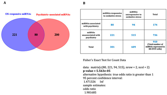 To screen for prior association with psychiatric disorders, we cross-referenced our observations with a list of 280 psychiatry-associated miRNAs collated by Smigielski et al. in their systematic review [17]. This analysis revealed that 23% (n = 48) and 34% (n = 44) of miRNAs for co- and pre-treatment, respectively, had previously been observed to be dysregulated in psychiatric disorders (Supplementary Tables S1 and S2). Combining the two treatments, the results showed that, of the 301 differentially expressed miRNAs, 80 were associated with psychiatric diseases (Figure 3A), and we observed significant enrichment of oxidative stress-responsive miRNAs in psychiatric disorders using Fisher’s exact test (p-value = 5.563 × 10−5) (Figure 3B).