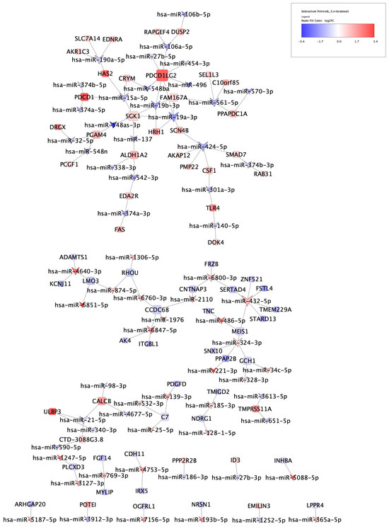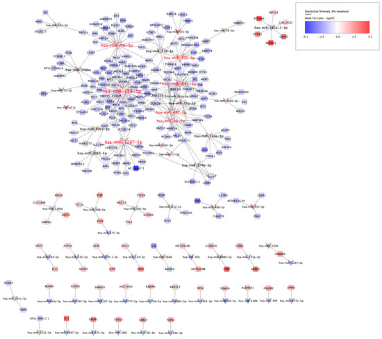 By comparison, in the pre-treatment condition, 59 unique miRNAs and 233 unique mRNAs were significantly and negatively correlated through 312 direct interactions (−0.99 < correlation coefficient < −0.97 and FDR < 0.05) (Supplementary Table S5 and Figure 5).