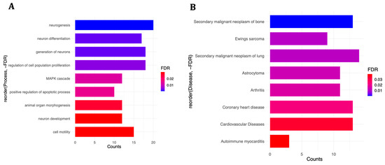 Enrichment analysis for 69 differentially expressed mRNAs in SH-SY5Y cells negatively correlated with differentially expressed miRNAs following simultaneous treatment with ATRA and H2O2. (A,B) illustrate enriched biological processes and diseases, respectively. For a complete detailed list, see Supplementary Table S6.