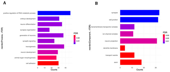 The 233 mRNAs negatively correlated with the pre-treatment-affected miRNAs were enriched in similar neurobiology-related processes as well as synapse organisation (17 genes) and synaptic signalling (24 genes) (Figure 7A). These were mostly localised in the synapse (33 genes) and cell junction (32 genes) (Figure 7B), and, interestingly, they were involved in two neurodevelopmental disorders: intellectual disability (ID) (35 genes) and global developmental delay (GDD) (19 genes). Supplementary Table S7 lists the statistically significant enriched categories and their corresponding gene sets. Interestingly, when we focused on the top 7 most connected miRNAs, with at least 10 connections, and their 134 negatively correlated mRNAs (down-regulated), they also returned very similar ontologies, including neuron differentiation (23 genes), synapse organisation (13 genes), synaptic signalling (17 genes), and intellectual disability (22 genes) (Supplementary Table S8). By contrast, the remaining 99 mRNAs were not enriched in any relevant categories. This suggests that the functional impact of the miRNA-mRNA interaction network in the pre-treatment experiment is coordinated by the seven miRNA nodes or hubs with the highest number of interactions.