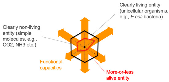 One way to formalize this intermediate zone of degrees of life (“lifeness space” or zone of “aliveness”) is to affirm the existence of a graded scale between the clearly non-living at point 0 (such as elementary molecules, e.g., CO2, NH3...) and the clearly living at point 1 (represented by sophisticated unicellular organisms undeniably alive to our eyes, e.g., well-studied bacteria such as E. coli or M. genitalium) [32,33,35,62].