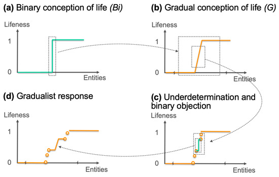 Another element to consider is the epistemic perspective that is adopted when advancing (Bi), where the epistemic perspective refers to the angle of describing a phenomenon (which is reflected notably in the choice of descriptive variables). Indeed, it is entirely possible that a threshold transition according to one perspective might turn out to be gradual according to another perspective. In the case at hand, the epistemic perspective seeks to characterize the existence or non-existence of a major lifeness threshold capable of distinguishing entities in the world. This perspective presupposes that, at a given point in time, all existing entities are somehow listed and sorted in a principled way, for example, in ascending order of complexity—or with another metric such as assembly theory [68]—and then that their lifeness is evaluated. Whether (Bi) or (G) are true should then be seen on the plot of this lifeness as a function of entity complexity ranking, either showing significant threshold transitions or gradual ones (Figure 3, orange plots).