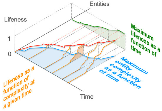 Yet, one can also seek to characterize how the maximum level of lifeness changes over time. This perspective is particularly relevant when considering the historical question of the origin of life. The descriptive variables change compared to the first, synchronic case: we now have to consider the plot of maximum lifeness over time (Figure 3, green plot), a perspective that can fuel questions about underlying evolutionary processes [69,70,71,72,73,74,75]. One can also be interested in the evolution of the maximum degree of complexity through time, which is yet another perspective on the overall same class of phenomena (Figure 3, blue plot). The key point is that what appears as a threshold transition according to one perspective may turn out to be a gradual transition according to another perspective. For example, what may appear as a threshold transition according to a synchronic perspective (existence of a lifeness threshold between certain entities at a given moment) may prove to be the result of a gradual perfection of a given type of entities over time (or even an increase in lifeness associated with the disappearance of intermediate entities).