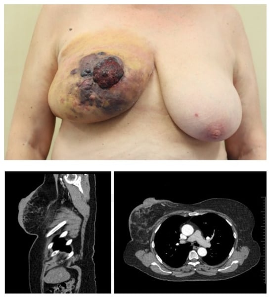 Clinical images (top) of a patient with post-radiogenic angiosarcoma, and corresponding CT thoracic images (bottom) in two planes.