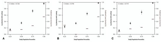 Calibration plots of actual 5-year overall survival (left y-axis, black boxplots) against predicted 5-year overall survival (right y-axis, brown vertical bars) of the Sarculator in percentage. The x-axis shows the percentiles of the study population. (A) Actual and predicted 5-year overall survival for the complete patient cohort, (B) for primary and (C) for secondary angiosarcoma patients.
