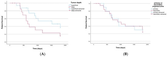 Kaplan–Meier survival analysis: (A) illustrates patient survival (x-axis) relative to time in days (y-axis) stratified by tumor depth. The blue curve represents patients with tumors located above the muscle fascia, while the red curve denotes subfascial location. (B) Depicts Kaplan–Meier curves for patients with primary angiosarcoma (blue) and secondary angiosarcoma (red). The vertical lines indicate censored data.