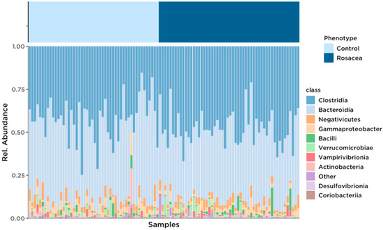 Bar plot with calculated relative abundances in rosacea patients and controls. Taxa with the highest abundances at the class level were visualized for each sample.