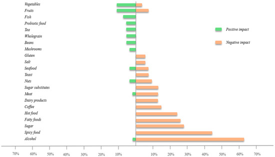 Rosacea patients’ subjective assessment (%) of food items with beneficial (green) and negative impact on the clinical severity (red).