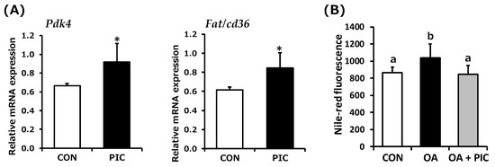 3.3. PIC Upregulated the Expression of Genes Involved in Fatty Acid Utilization and Suppressed Fatty Acid Accumulation