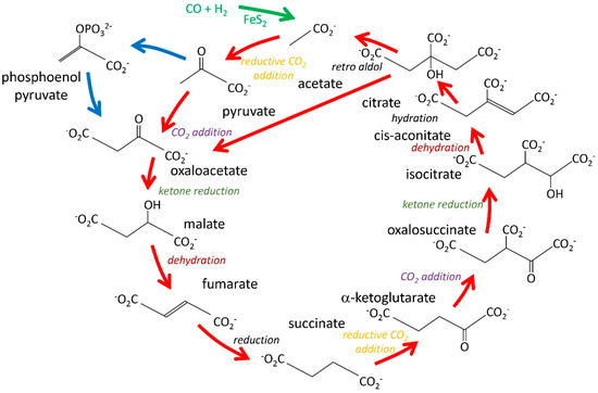 A possible prebiotic reductive TCA cycle. The acids shown here differ in some places from those in a standard TCA diagram and are drawn such that diametrically opposite acids and the reactions that convert them are homologous. Homologous reaction types are indicated in different colored italic fonts, while the three reactions in black font are not homologous. The figure also indicates possible input to the cycle from CO and hydrogen catalyzed by iron pyrite (green) and an alternative route from pyruvate to oxaloacetate that goes via phosphoenolpyruvate (blue arrows), which functions to link the TCA cycle to pathways involving phosphosugars. Many of these compounds are the starting points for important modern biosynthetic pathways, supporting their inclusion in an early autocatalytic cycle: α-ketoglutarate for amino acids (and via glutamine for the nitrogen in all amino acids); acetate for fatty acids and isoprenoids (i.e., all lipids in all three branches of life); pyruvate for sugars and alanine; oxaloacetate for aspartate and pyrimidines; and succinate for pyrroles. We note that the steps from oxaloacetate to succinate are chemically identical to the modern route for fatty acid synthesis. Diagram based on Figure 4.1 in [1]. There is also a similar diagram in [28].