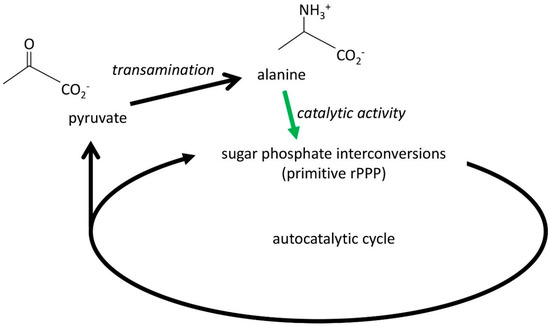 The reactions of the PPP are mainly aldol and retro-aldol reactions, which take place at reasonable rates even uncatalyzed [59]. Some of the reactions are redox reactions (oxidative when the PPP runs in its standard direction, or reductive when it runs in the reverse direction), which can be catalyzed by iron sulfides [60]. Thus, a reductive PPP (rPPP) has been proposed as occurring in prebiotic conditions [4,35]. In keeping with Guideline 1, the rPPP should not be seen as a pathway for producing glucose phosphate, but as a set of reactions for interconverting phosphosugars and for fixing carbon by reductive additions. It could become cyclic by adding a few simple aldol reactions, in which case it would be an autocatalytic cycle that uses reducing power and CO2 to generate increasing concentrations of sugar phosphates.