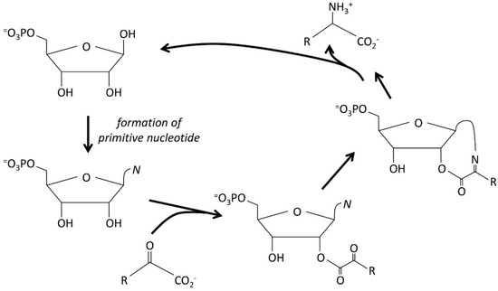 Thirdly, the conclusion so far is that there must have been a supply of available nitrogen and that this must have allowed the synthesis of a wide range of nitrogenous bases. Guideline 4 (autocatalytic selection) suggests that the concentrations of these bases increased because they were useful catalysts, but for what? There has been an interesting suggestion that nitrogenous bases might act as catalysts for the formation of more amino acids—most obviously by forming a Schiff base with a ketoacid and, thus (in a reductive environment), eventually leading to a primitive transamination (Figure 3) [41]. This is an attractive idea, not least in that it provides physical interactions between specific bases and specific amino acids and thus points towards a possible origin of the genetic code [41]. This is, therefore, an idea worth considering carefully, but it suffers from the major disadvantage that no reactions like this occur in living systems.