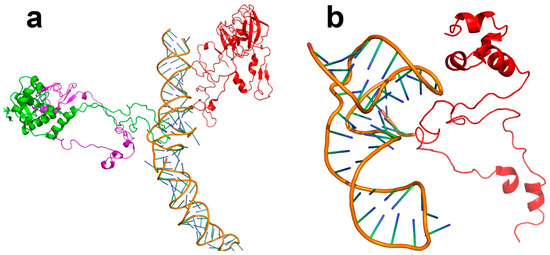 Arguably the most primitive macromolecular catalysts still found in modern biology are the RNA catalysts. The best characterized of these is the ribosome. There are other examples of ribonucleoproteins, including snRNPs (involved in RNA splicing) and the signal recognition particle (SRP), which guides nascent proteins onto and through membranes. These all have an RNA function at their heart, with the protein forming a protective coat. This has been shown convincingly for the ribosome, of which the most primitive part is the peptidyl transfer center [93], which consists of a small piece of RNA, with a markedly non-globular protein stabilizing it (Figure 5a). Similar arrangements are found in snRNPs (Figure 5b) and the SRP [94]. It, therefore, seems likely (following Guideline 2) that the earliest proteins were simple polypeptides that stabilized RNA-like catalysts and later acquired catalytic functions as cofactors [95]. They would gradually acquire more defined sequences and functions—another example of autocatalytic selection.