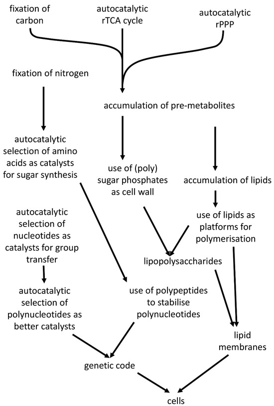 - Wächtershäuser, G. Evolution of the first metabolic cycles. Proc. Natl. Acad. Sci. USA 1990, 87, 200–204. [Google Scholar] [CrossRef]
