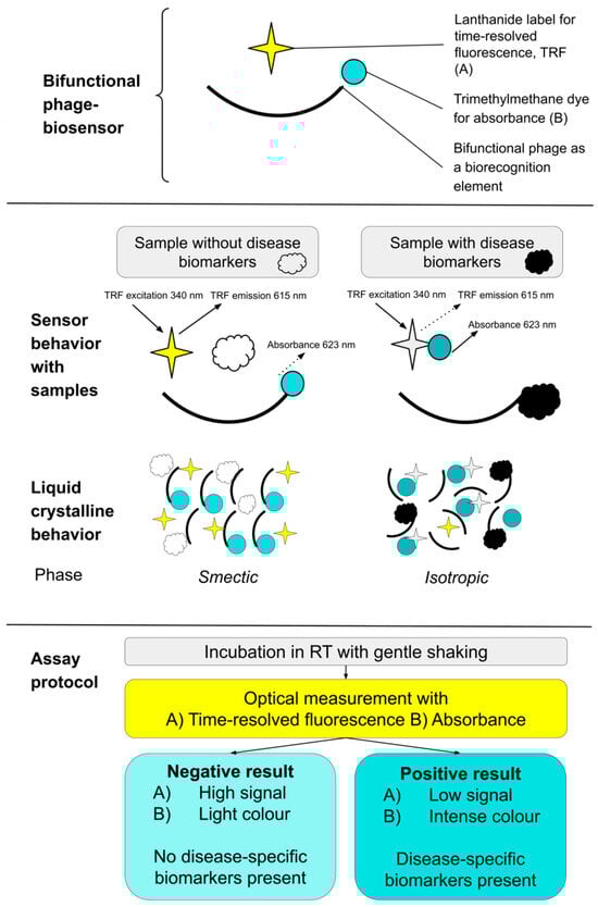 Schematic presentation of bifunctional phage biosensor method. The biosensor consists of three components, including the bifunctional phage (affinity with the dye and disease-specific biomarkers), lanthanide label, and trimethylmethane dye. The biosensor behaves differently with a negative sample not containing the disease-specific biomarkers and a positive sample containing them. The result is measured with TRF and/or absorbance. In more detail, the detection is based on the liquid crystalline (LC) behavior of the bifunctional phage. Depending on the sample, phages either order themselves with dye molecules (negative sample) or their organized structure is contravened (positive sample).