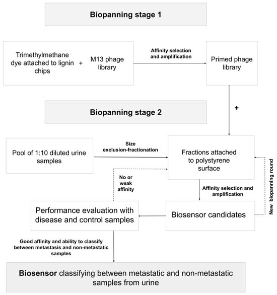 Schematic presentation of the biopanning strategy for phage biosensors detecting metastatic cancer from fractionated urine. In the first biopanning stage, the primed phage library is prepared with affinity selection toward trimethylmethane dye. This library is used in the second biopanning stage to perform affinity selection toward size exclusion-fractionated diluted urine samples. Biosensor candidates (phages after affinity selection) are amplified and tested with clinical disease and control samples. In instances in which there is no or weak affinity, the process of secondary affinity selection is iterated or repeated until a satisfactory classification is attained. Then, a biosensor is ready to be used in assays to distinguish between metastasis and clinical samples.