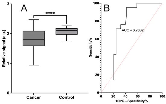 Cancer detection with a chemical sensor based on a phenoxazine non-fluorescent dye. Absorbance (λ = 610 nm) was measured after 5 min of incubation. Plot (A) displays the signal mean of three replicate measurements, with SEM as error bars between the cancer samples (n = 53) and non-cancerous control samples (n = 21). **** Statistical significance (p < 0.0001) between cancerous and non-cancerous samples was reached. Plot (B) presents the ROC curve, with an area under the curve of 0.73. The calculated sensitivity of the assay is 71%, and the specificity is 75%.
