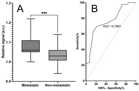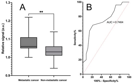 Classification of metastatic cancer and non-metastatic cancer samples with the phage biosensor based on bifunctional phages. Absorbance (λ = 623 nm) was measured after 180 min of incubation with the developed metastasis-specific biosensor and control biosensor. Plot (A) displays the standardized signal mean of three replicate measurements, with SEM as error bars between the metastatic samples (n = 28) and non-metastatic cancer samples (n = 25). Signals for each sample were standardized by dividing signals of the biosensor by the signals of control biosensor. ** Statistical significance (p = 0.0017) between metastatic and non-metastatic samples was reached. Plot (B) presents the ROC curve with an area under the curve of 0.75. The calculated sensitivity of the assay is 68%, and the specificity is 79%.