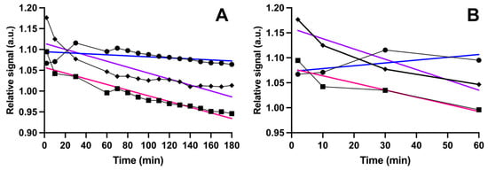 Kinetic behavior of biosensor with samples. The blue line shows the slope for relative color (absorbance) change as a function of time with a metastatic sample (dots), the purple line shows the slope for a non-metastatic (rhombus), and the pink line shows the slope for a control sample (square). Plot (A) shows that the slope of linear regression during 180 min was smaller for the metastatic sample (−0.0001235) than for the non-metastatic (−0.0007139) and non-cancerous control samples (−0.0006815) (A). Plot (B) shows that during the first 60 min of detection, the slope was positive for the metastatic sample (0.0005643) and negative for the non-metastatic (−0.002061) and control samples (−0.001428).