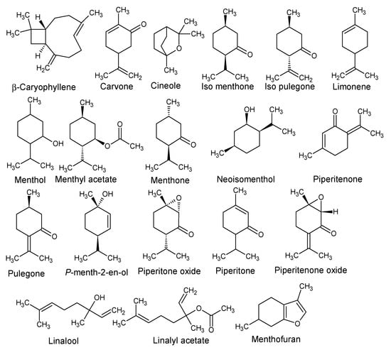 In the present study, we selected a total of 19 essential oil constituents (Table 1, Figure 1) reported to be the main EO composition of Mentha spp. [21], which were picked up as powerful natural sources of antimicrobials.